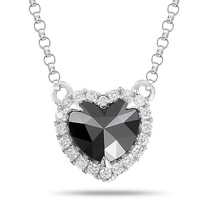 This alluring Black and White Diamond Heart Pendant showcases an AA quality heart rose-cut Black Diamond, accented with twenty lustrous Diamonds prong set in 14K White Gold. Approximate Black Diamond Weight: 0.71 Carats. Approximate Diamond Weight: 0.14 Carats. The entrancing pendant comes finished with an 18-inch 14K White Gold Cable Link Chain.