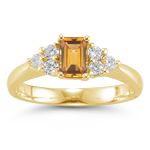 This awe-struck Three Stone Green Amethyst and Diamond Ring highlights an AAA quality emerald-cut Green Amethyst, embellished with two appealing emerald-cut Diamonds prong set in 18K Yellow Gold. Approximate Gemstone Weight: 5.84 Carats. Approximate Diamond Weight: 0.33 Carats. A spectacular way to add a touch of color.