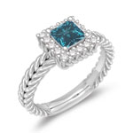 This tantalizing Sky Blue Topaz Scroll Ring is highlighted with an AAA quality emerald-cut Sky Blue Topaz Solitaire prong set in 14K White Gold. Approximate Gemstone Weight: 3.24 Carats. Embrace glamour with this tantalizing ring.
